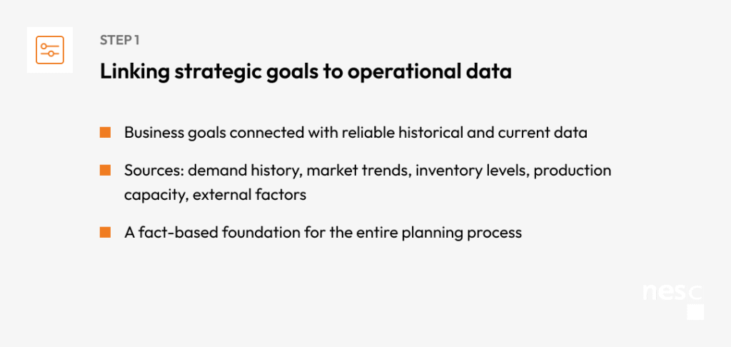 Planning in SAP IBP starts with the alignment of company-wide objectives (e.g., revenue targets, service levels) and the integration of historical and real-time data: